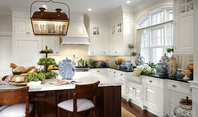 I like seeing a few pieces of pottery or china on an island of different heights, Habersham