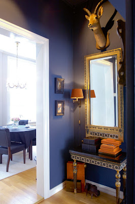 The dusky blue paint in this entryway sets the tone for this home - you get a sense that it will have a historic, eclectic, and mature feel.via Maison Interiør